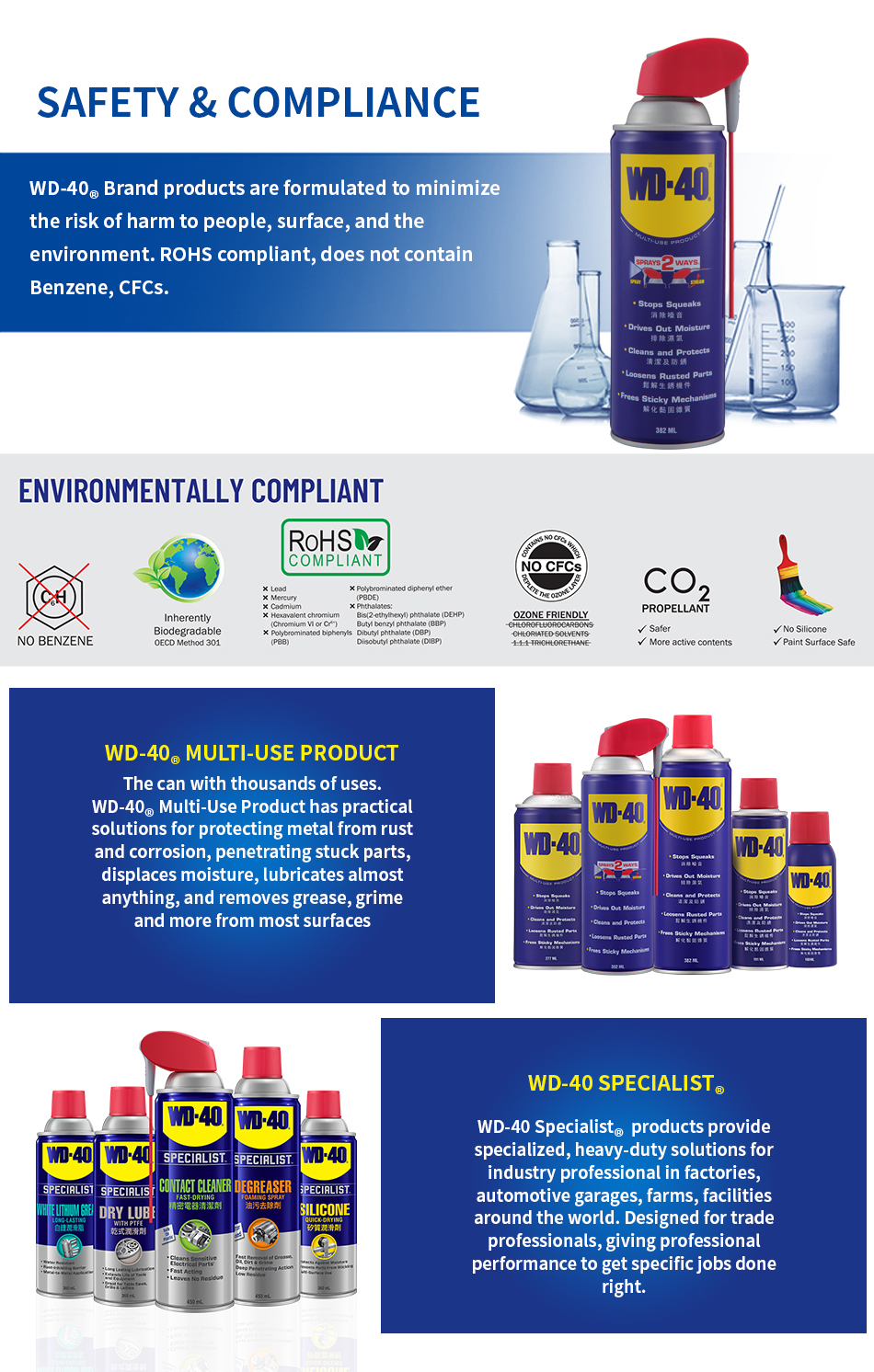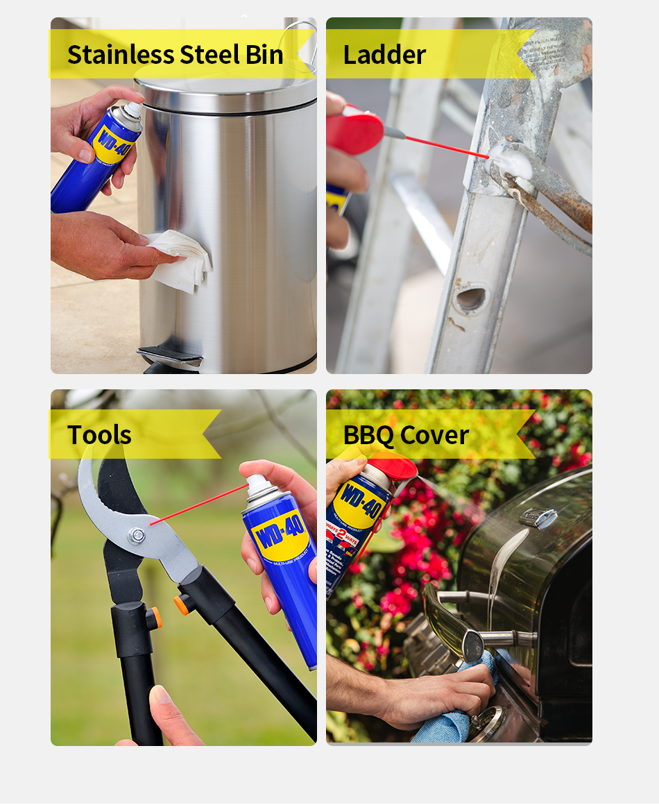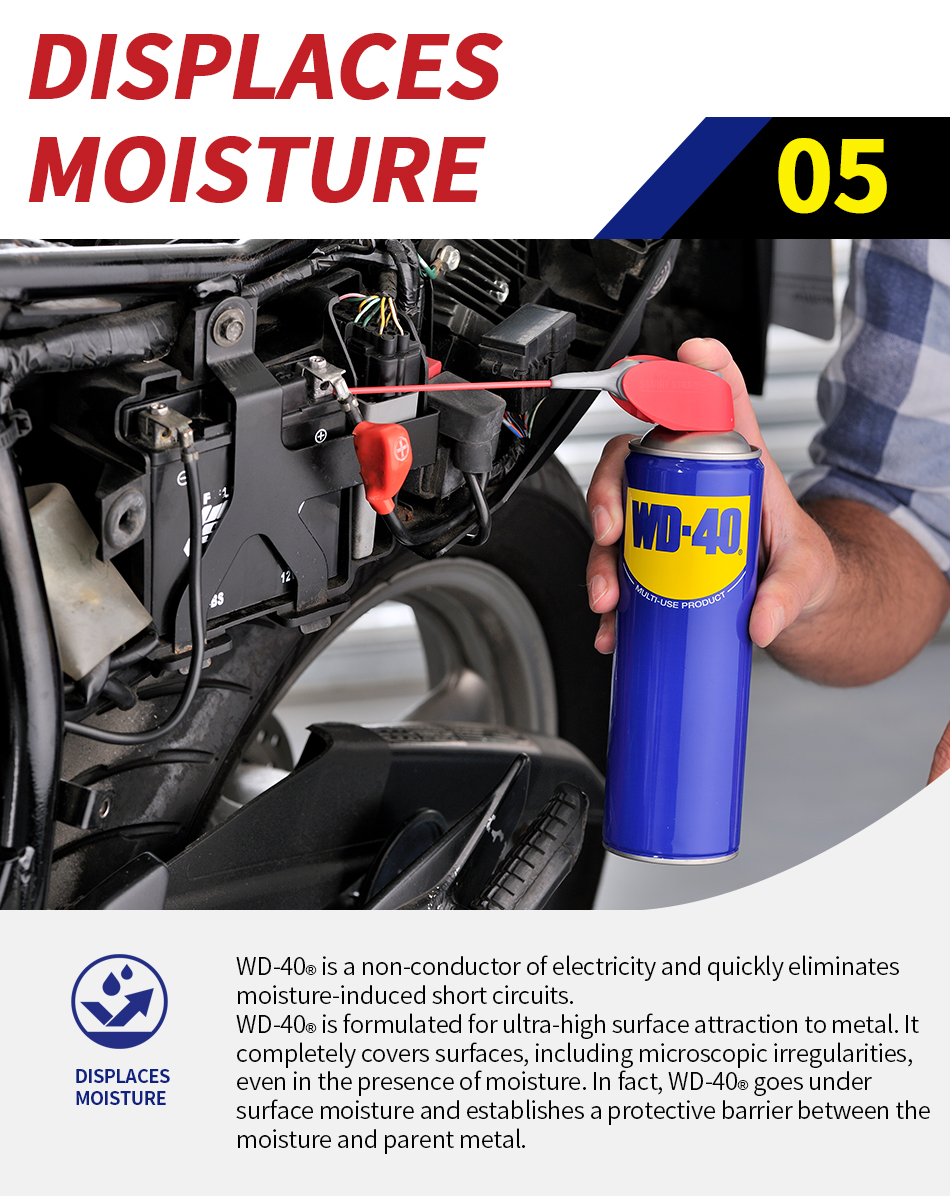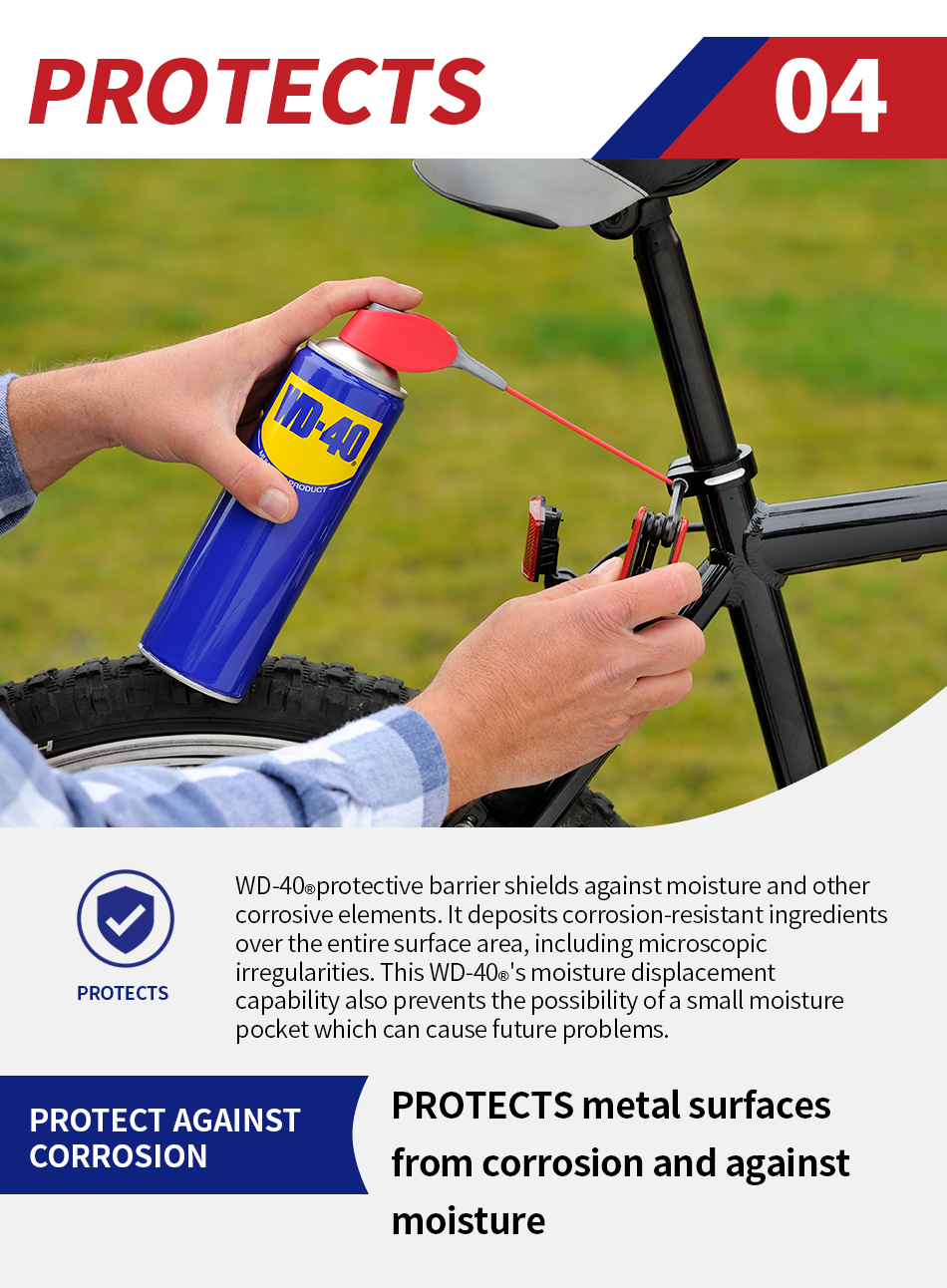 WD-40® Multi-Use Product protects metal from rust and corrosion, penetrates stuck parts, displaces moisture and lubricates almost anything. It even removes grease, grime and more from most surfaces.
